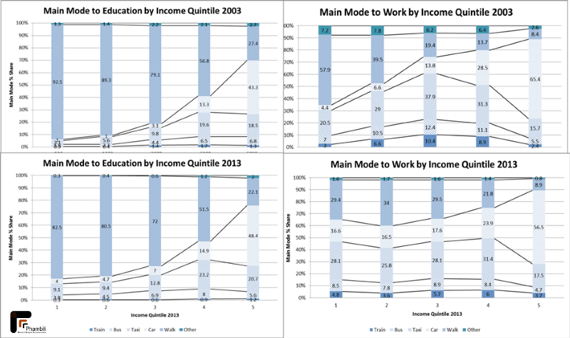South African’s choice of mode is an income based decision. On average, minibus taxi’s carry 26% of the working population to their occupations, whilst 28% of the total work trips are performed on-foot. Most of these trips are performed by middle-and-lower income earning groups, the highest 25%, in terms of income travels by means of car (49%) over long distances and walk very little. This implies that there is more foot, bicycle and transit traffic provision necessary, since the car is an elitist alternative for a democratic nation.