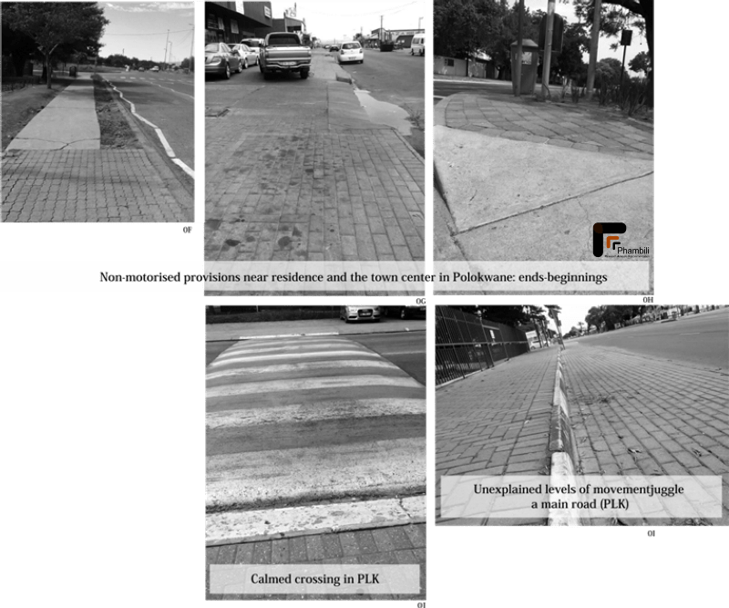 I visited Polokwane and reside in Mahikeng. Both towns feel subtle, and breathe a confused air in the way non-motorised urban movement is considered. OF and OJ are samples of good pedestrian measures: OF — when lower pedestrian movement is expected, tighten up the space, add some trees, why not a bike lane? OJ — traffic calming zebra crossing in a residential area: might need some warning signs studded on the sidewalk for the visually impaired. OG, OI and OH are examples of the unnecessary: why the double step in OI? Why cycle up, or push your trolley to hit poles and trash bins on one side? These questions sprang up during my bike trip. But, they felt distant when I realized that it was a Sunday, and no real traffic is to be expected. Thus, these inconveniences will go unnoticed until it is pay-day for the walking masses.