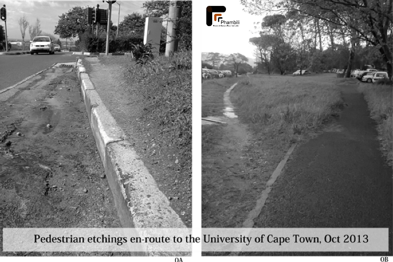 The City of Cape Town, for example, is pulling enormous efforts to provide for non-motorised travel infrastructure, culture and mobility on a macro-scale. These include bicycle lanes, universally accessible Bus Rapid Transit and transit interchanges. Yet, there are still those odd moments when pedestrians go one way, whilst such provisions go another (0A and 0B) — like on the UCT campus.