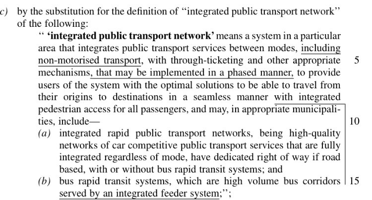 At the base of the amended definition, system wide modal integration includes non-motorised transport. Adopting an adopt-shift-improve approach the policy position encourages mobility and access services that may convince more people to start or continue using public and non-motorised transport. Comparing (a) and (b) the rapid nature of the service does not necessarily need to be bus based. Which is a profoundly important step because paratransit services can be used as part of a neural network of local areas and urban areas in a variety of ways — not just as a feeder. In other words, all forms of public passenger transport can now be integrated into a system operated to achieve the national vision for equitable access and mobility more than ever before. So municipalities planning mobility and access systems should be brave and bold. Industry practitioners should be actively developmental, innovative and creative as hell. The lazy era is crumbling quickly for public and private sectors.