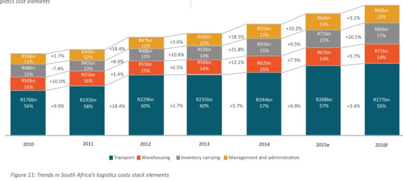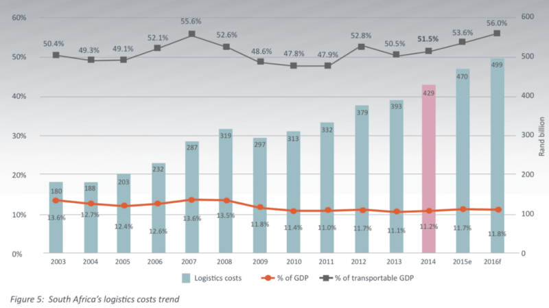 In the broader macroeconomic context, the key issues related to transport tend to be measured through logistics costs. One of the most consistent reporting tools have been provided by a cost model from Jan Havenga. Initially this was thorough the ‘State of Logistics Survey’; today the most recent publication is titled the Logistics Barometer. As a point of departure form a costing perspective is through these reports.