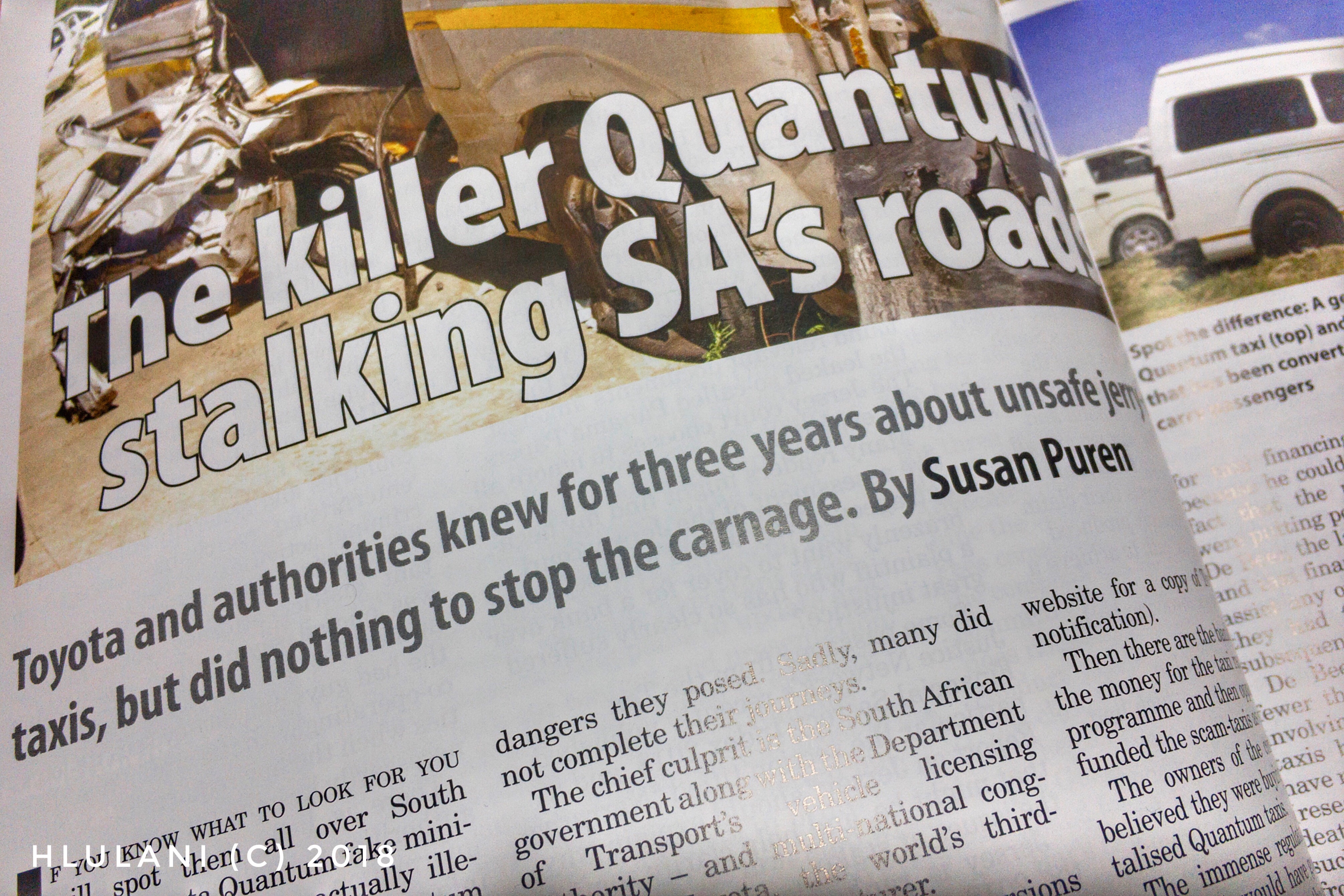 NOSEWEEK BLEEDS— “If you know what to look for you will spot them all over South Africa: Toyota Quantum fake minibus taxis which are actually illegally converted Toyota Quantum panel vans that were designed to carry goods, not passengers. Somehow, with official sanction, these vans bypassed the safety standards and specifications that are compulsory for any passenger vehicles licenses to drive on South Africa’s roads.”—Susan Puren, August 2018, Noseweek