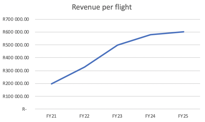 Heavy SAA in 2024: The much heavier SAA has a revenue structure that is dominated by passenger revenues (74%), with low load factors. Fuel surcharges overwhelm ancillary income by 8%. The cost structure takes a different form, much larger fuel costs (15%). Other operating costs are, interestingly modelled to take 45% of the total costs although in 2021 its R1.9bn, but by 2024 it is R7.4bn. Similarly, with a larger staff component, labour costs rise significantly although their share of costs reach 17%. The airline morphs within a four year period– given its history, more scenarios should be tested.