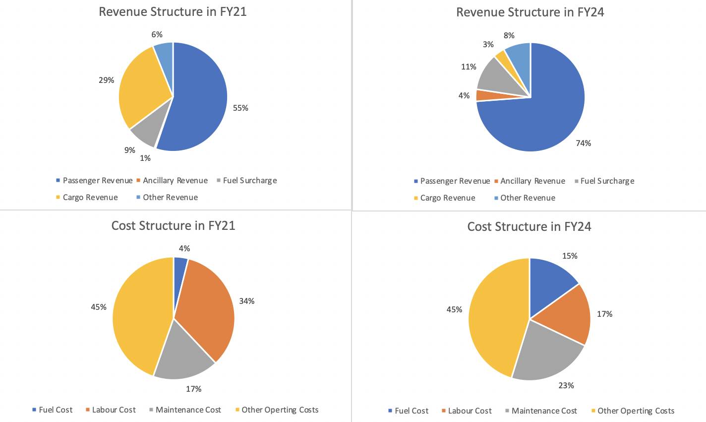 Lean SAA in 2021: The single scenario presented for SAA by the BRP’s consultants describes two different airlines. One that operates in 2021, and another that operates in 2024. Revenue structures vary significantly largely due to the lower passenger volumes forecasted in 2021– this is a leaner airline. Ancillary revenue contributes 29% of the revenue base, which if expanded upon could be a lucrative drive. The cost structure is interesting because with fewer flights, and aircrafts fuel costs are dwarfed by other operating costs (45%) and labour costs (34%).